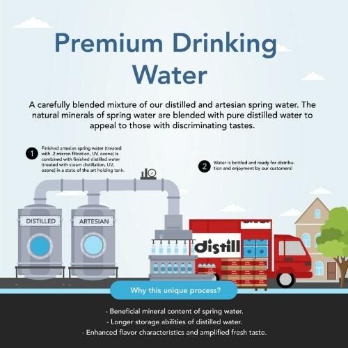 - Distillata spring water treated with 2-micron filtration, UV light, and ozonation