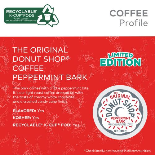 Need an excuse to have fun? Consider this your permission sip! The Original Donut Shop® Coffee. Satisfyingly simple. Cheerfully uncomplicated. The way coffee should be. This bark comes with a little peppermint bite. The Original Donut Shop® Peppermint Bark is our light roast coffee dressed up with the taste of creamy white chocolate and a crushed candy cane finish.